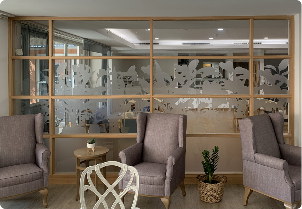 We created this design for an aged care facility to provide privacy in the cafe area for the residents. Produced on clear film using clear ink with a matte finish to create an opaque patterned print.